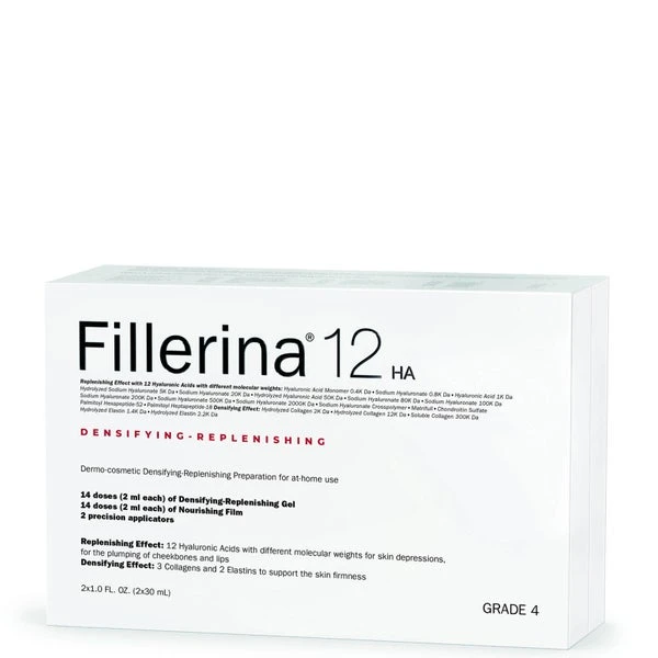Fillerina 12 Ha Densifying-Replenishing Gel – Water (Aqua), Glycerin, Hydrolyzed Glycosaminoglycans, Sodium Hyaluronate, Caprylyl Glycol, Carbomer, 1,2-Hexanediol, Pentylene Glycol, Hydrolyzed Elastin, Butylene Glycol, Sodium Hyaluronate Crosspolymer, Hydrolyzed Hyaluronic Acid, Hydrolyzed Collagen, Hyaluronic Acid, Tropolone, Hydroxypropyl Cyclodextrin, Phenoxyethanol, Hydrolyzed Sodium Hyaluronate, Decylene Glycol, Xanthan Gum, Leuconostoc/Radish Root Ferment Filtrate, Sodium Chondroitin Sulfate, Soluble Collagen, Palmitoyl Tripeptide-38, Phenylpropanol, Palmitoyl Hexapeptide-52, Acetyl Hexapeptide-37, Palmitoyl Heptapeptide-18, Sodium Benzoate, Sodium Hydroxide, Ethylhexylglycerin, Glyceryl Caprylate, Disodium Edta, Sodium Chloride, Sorbic Acid, Polyvinyl Alcohol.