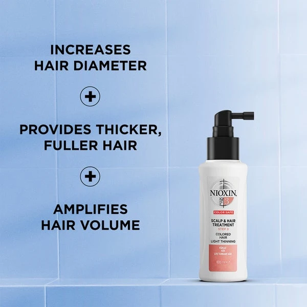 Refresh the scalp and increase hair volume with Nioxin’s 3-part System 3 Scalp & Hair Treatment for Colored Hair with Light Thinning. This diameter-increasing professional product refreshes the scalp and gives a healthy shine to your hair. With its Transactive Delivery System 2.0, the volumizing Nioxin leave-on treatment helps provide thicker hair by increasing the fullness of each hair strand. Nioxin Scalp & Hair Treatment is the final step of the 3-part System, which amplifies hair texture while protecting against breakage.