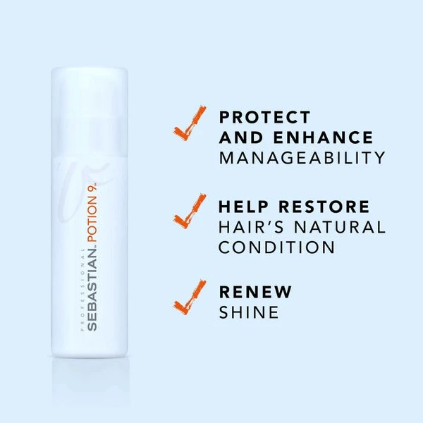 Apply Sebastian Potion 9 to damp or dry hair. Blow- or air-dry for silky, touchable looks, or use hot tools for refined curls. On dry hair, reapply to add texture and control. Apply anytime for an instant style boost.